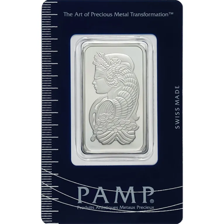 Renowned for its exceptional craftsmanship, PAMP Suisse delivers yet another masterpiece with this 1 oz Platinum Bar. Struck from .9995 fine platinum, it features the iconic image of Fortuna, the Roman goddess of fortune, one of the most recognized designs in platinum bullion.