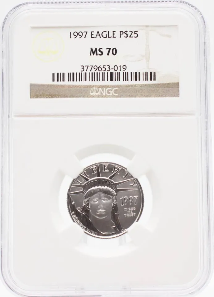 Looking to own a quarter-ounce Platinum Eagle from its first year of mintage? This 1997 $25 Platinum Eagle is a rare find, graded MS70 by NGC—a distinction achieved by less than 1% of the 27,000 coins minted that year.